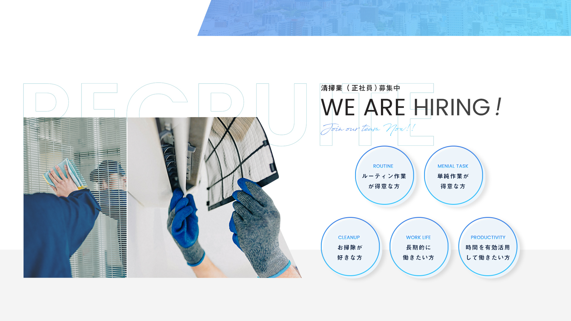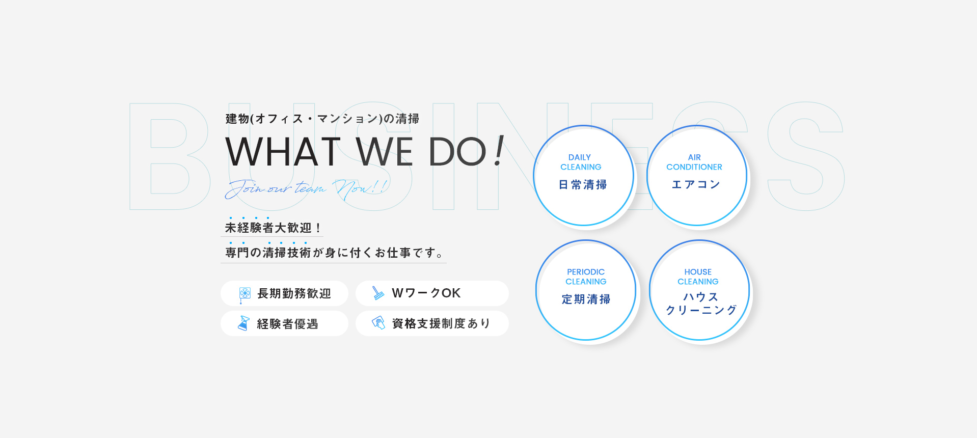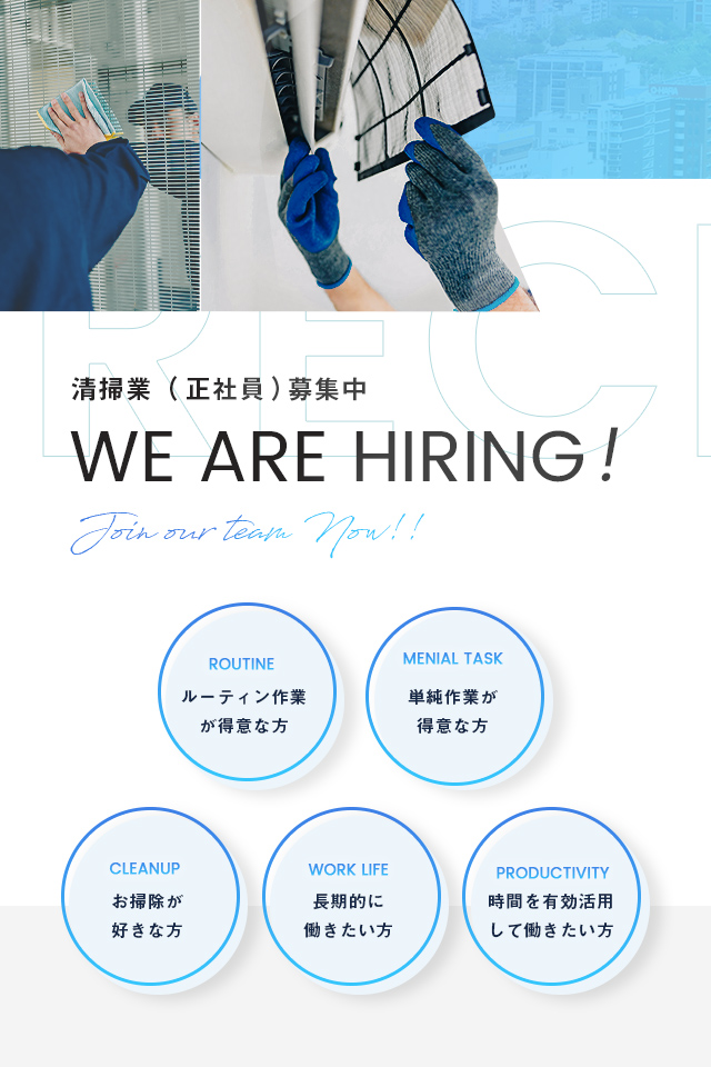 私たち株式会社progressは、お客様に喜んでいただけるサービスを提供できるように自己成長に励み続け、仕事を通して職場だけではなく、プライベートも充実できるようにお互いに協力し合い、幸せだと思える環境づくりを目指して日々の清掃業務に取り組んでいます。お客様に喜んでいただくため、自身のスキルの向上はもちろんの事、働くスタッフにも喜びや幸せを感じてもらうことで、より良いサービスを提供できるように成長していきたいと思います。