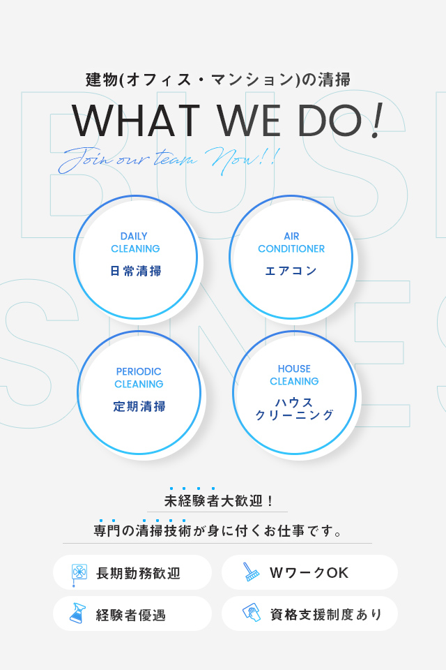 物件のハウスクリーニングや、ビル、マンションの日常清掃および定期清掃をご提供いたします。ビルやオフィスの共用エリアや各部屋の床清掃(ポリッシャー機械を使用した清掃)、ガラス清掃、ワックスがけなど、美観と清潔さを維持し、向上させることが目的です。 床やカーペットなどの機械による洗浄作業や、高所の窓ガラス清掃など、日常清掃では足りない部分を定期清掃として行っております。